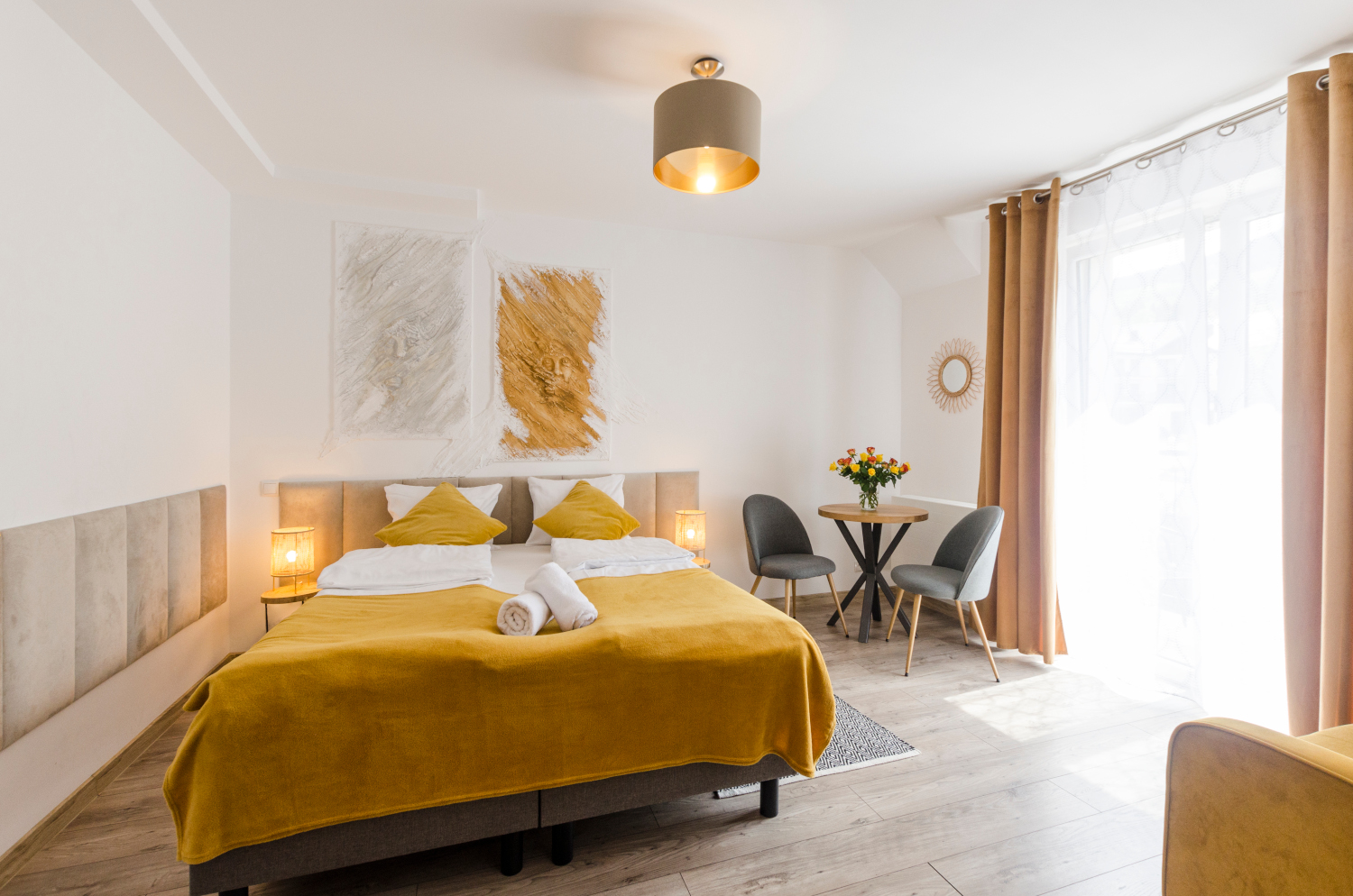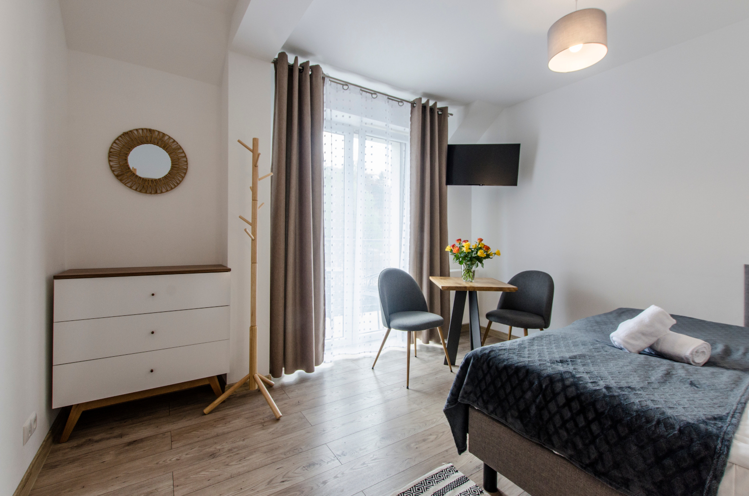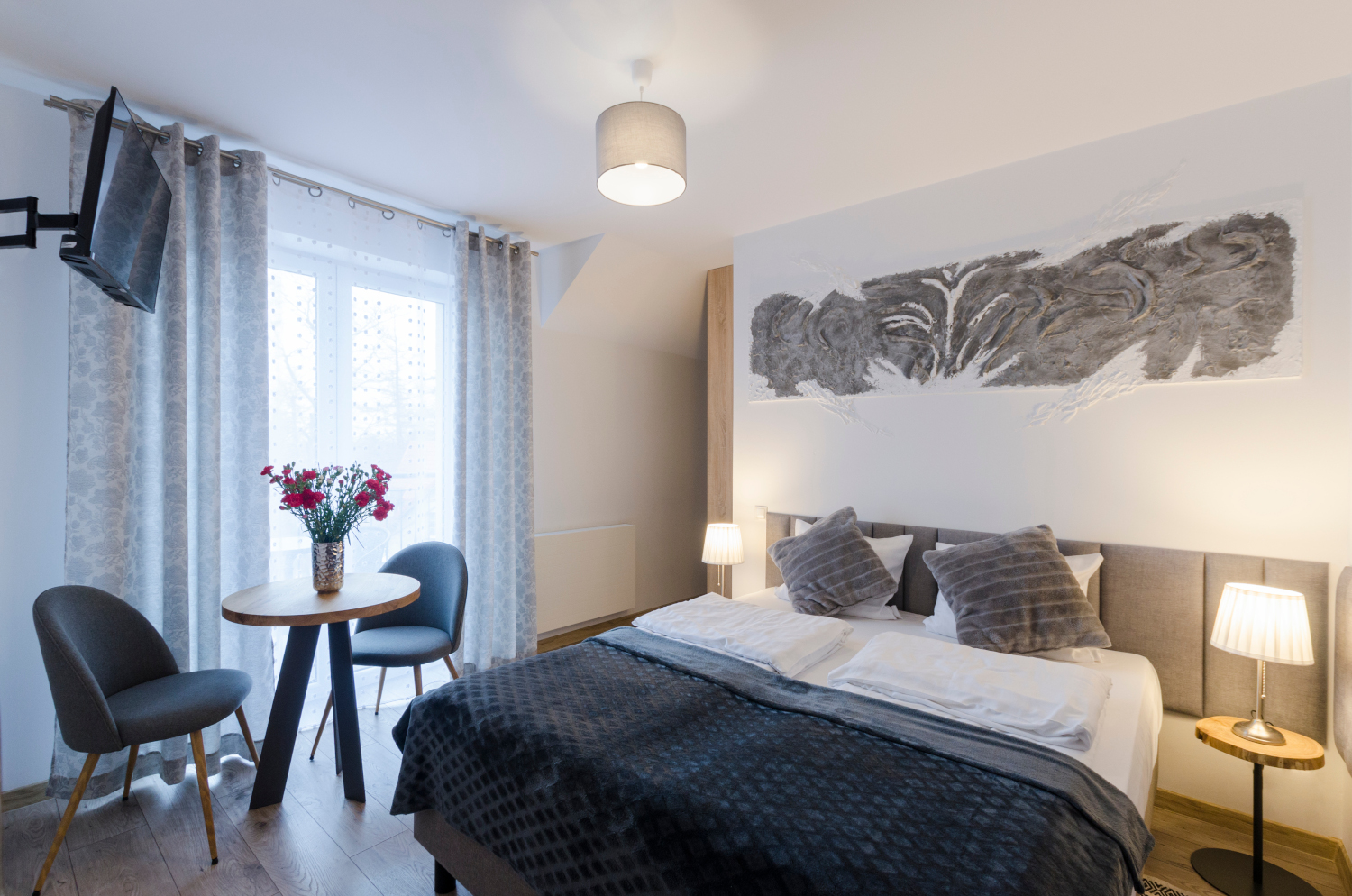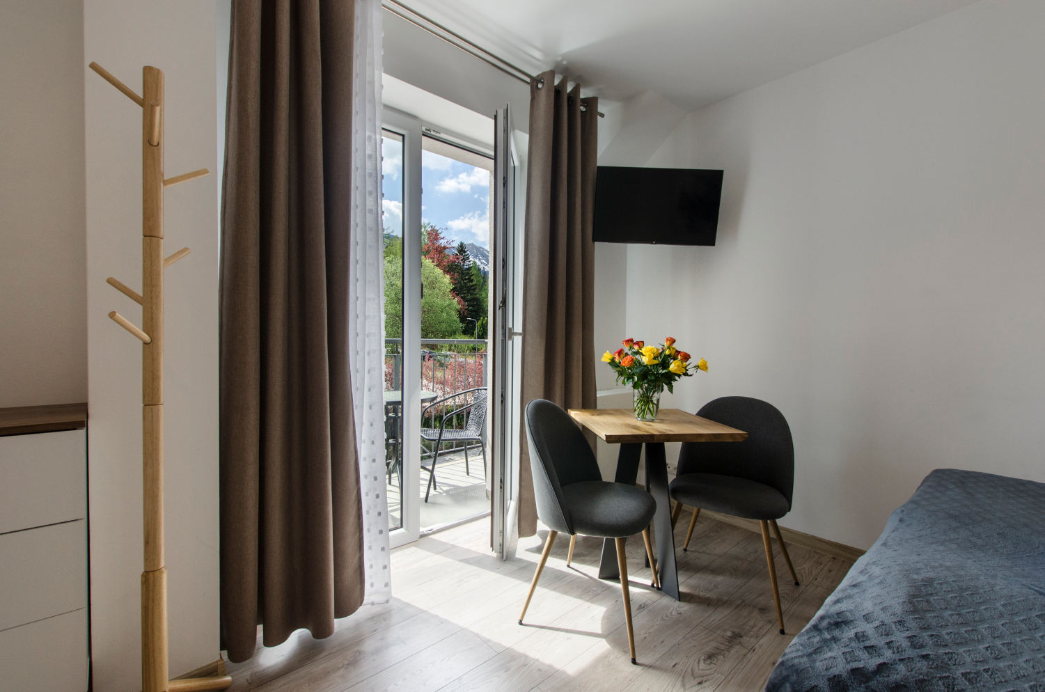 Komfortowy pokój 2 osobowy z balkonem i widokami na panoramę Karkonoszy. W pokoju znajdują się dwa łóżka, które można ustawić razem albo osobno. Wielkość pokoju jest idealna dla pary.