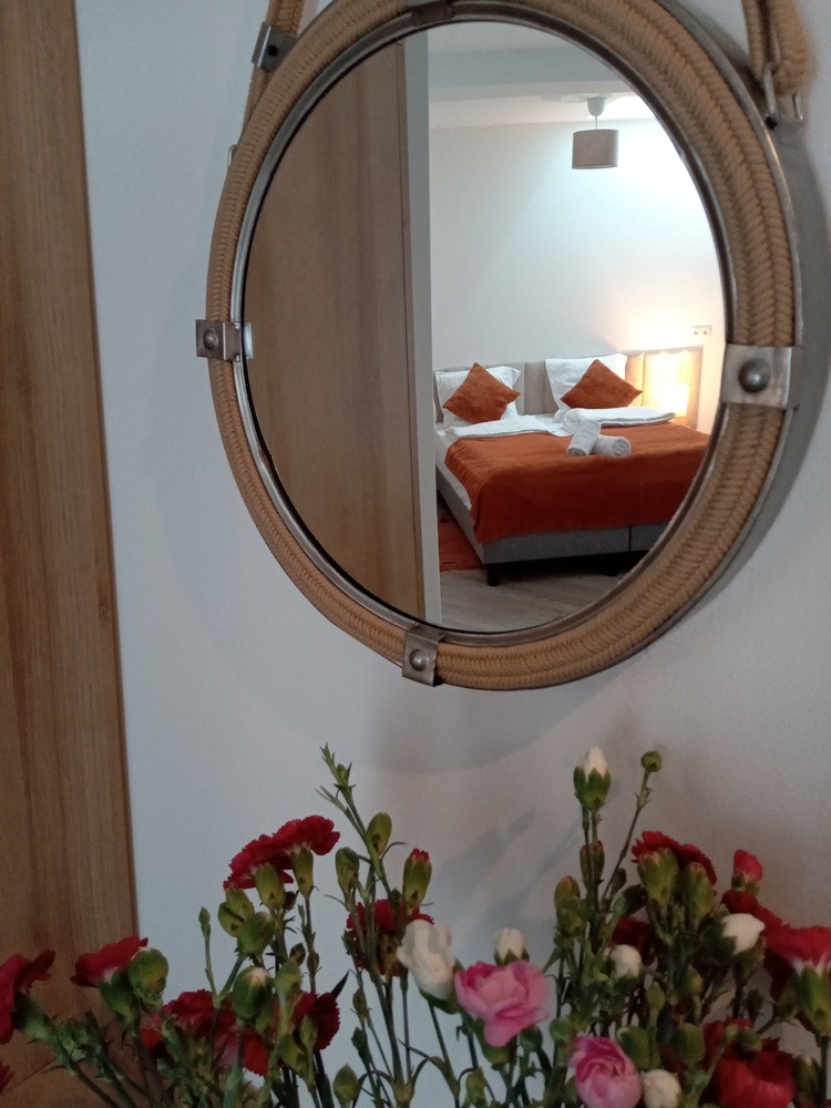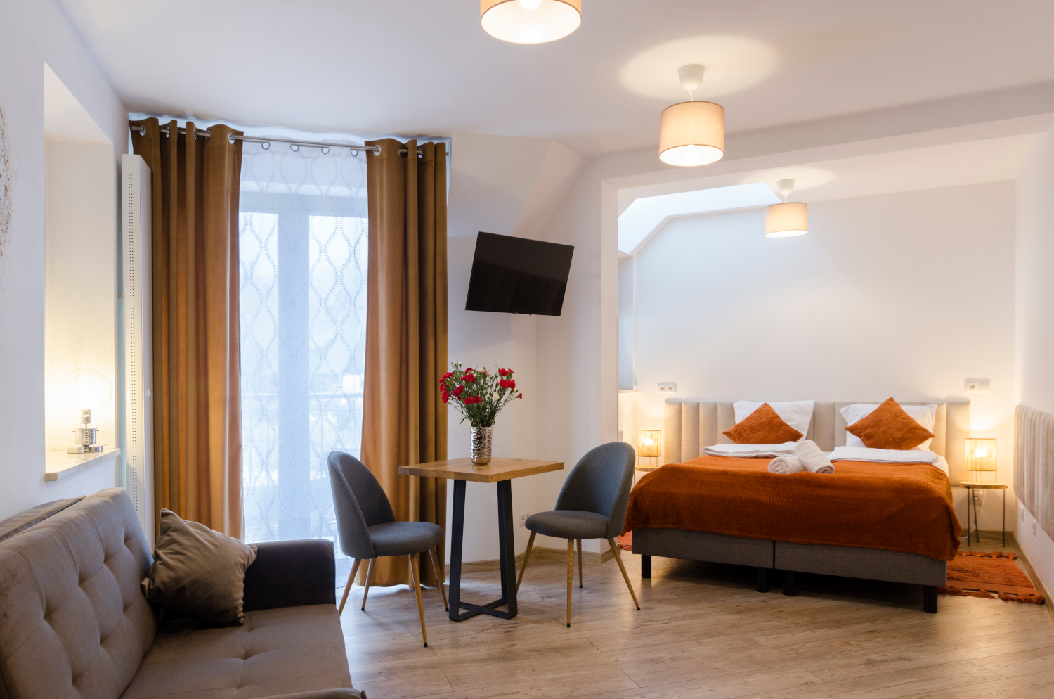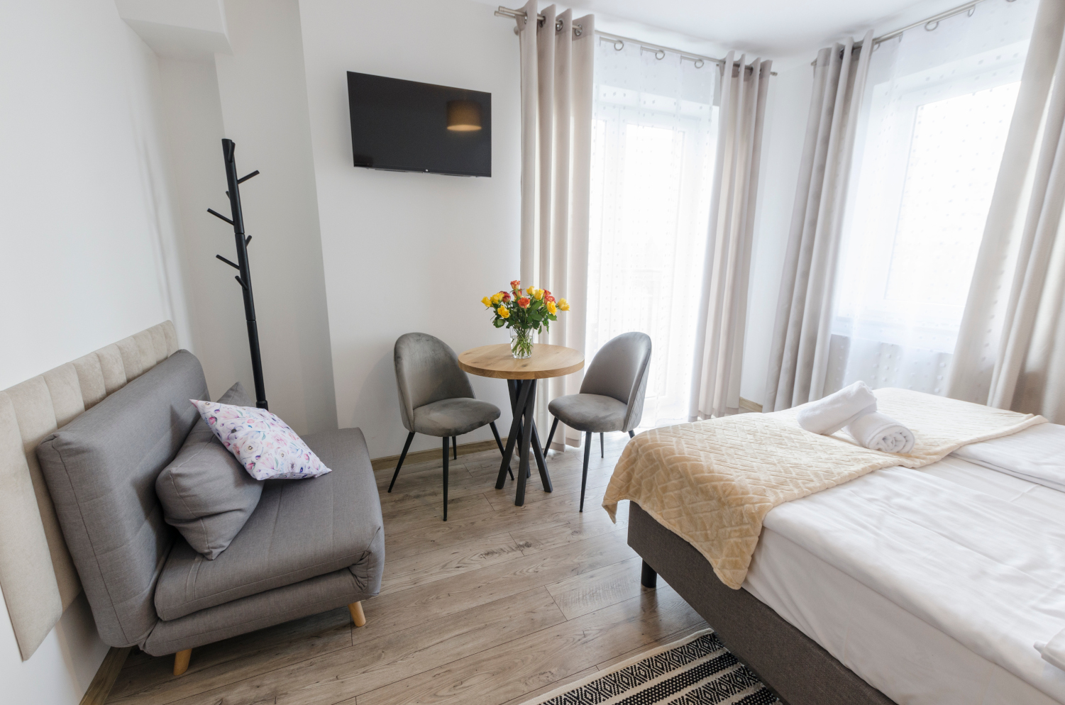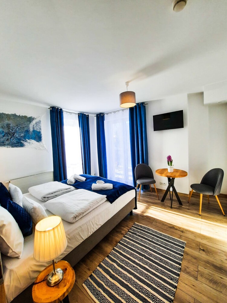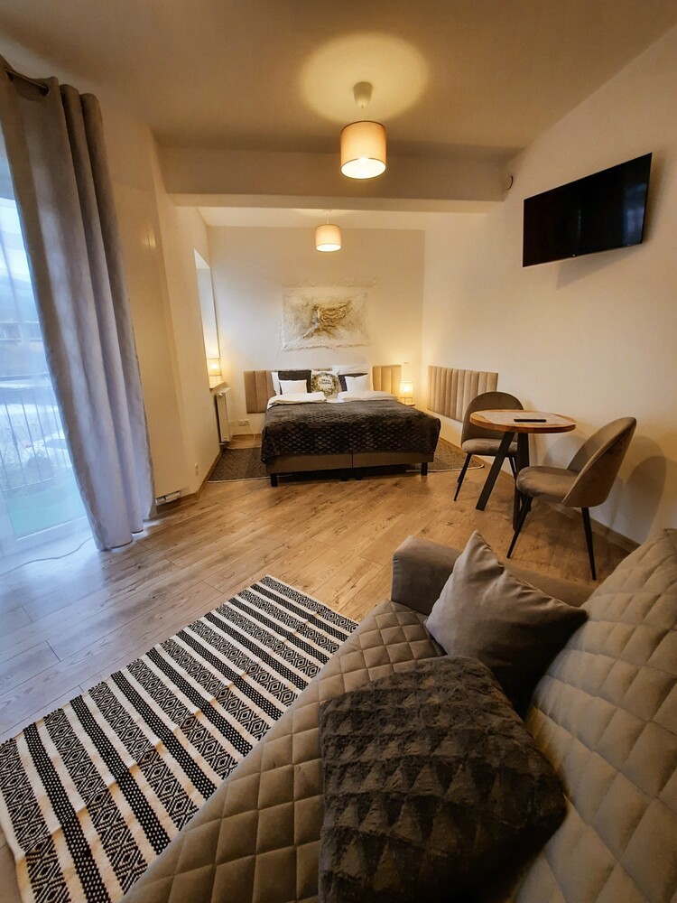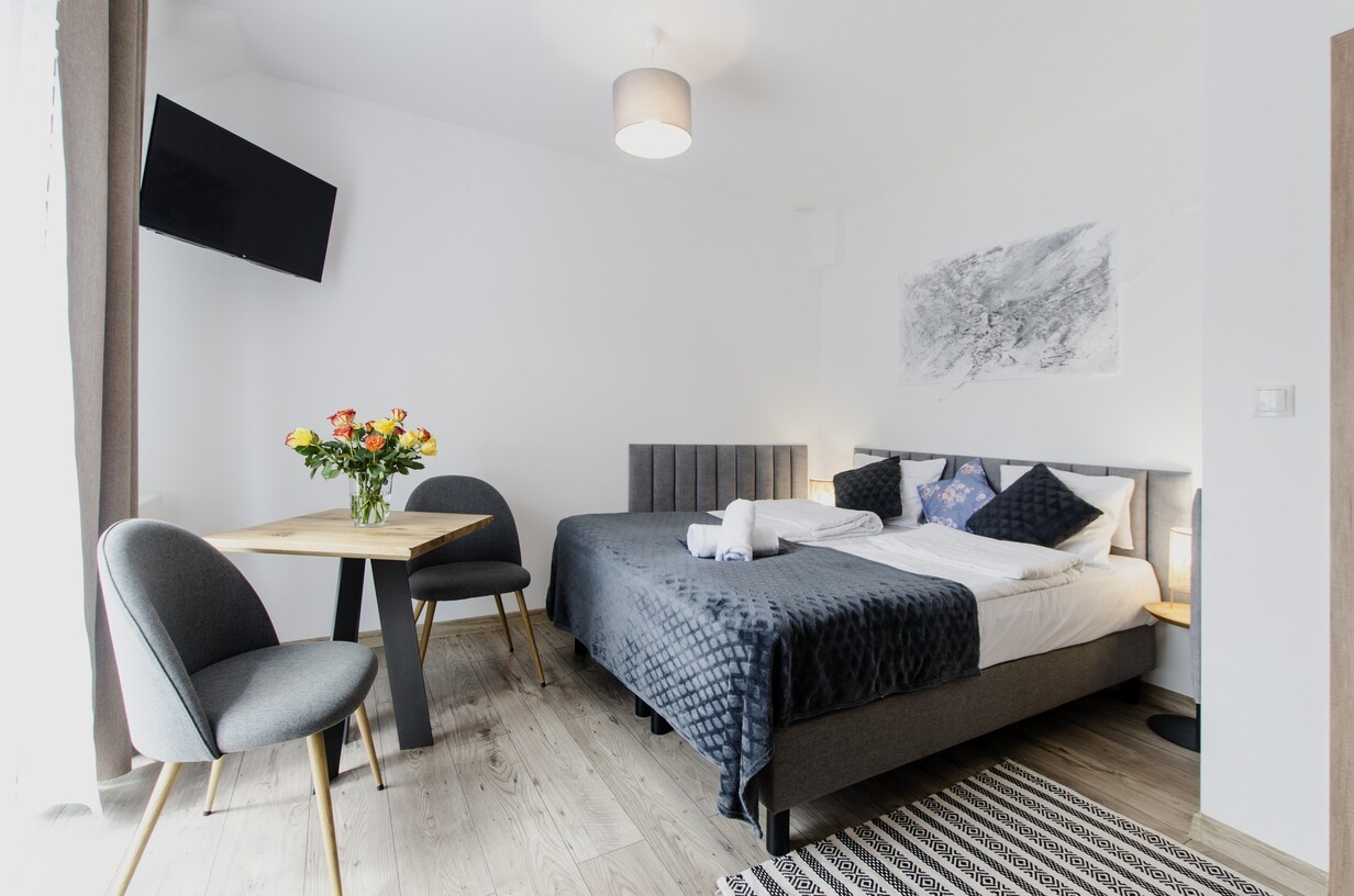 Rodzinne studio 3 osobowe z widokami na Kotlinę Jeleniogórską. W pokoju znajdują się dwa łóżka, które można ustawić razem albo osobno oraz rozkładana sofa. Wielkość pokoju jest idealna dla Rodziny z dzieckiem/dziećmi bądź 3 osób dorosłych.