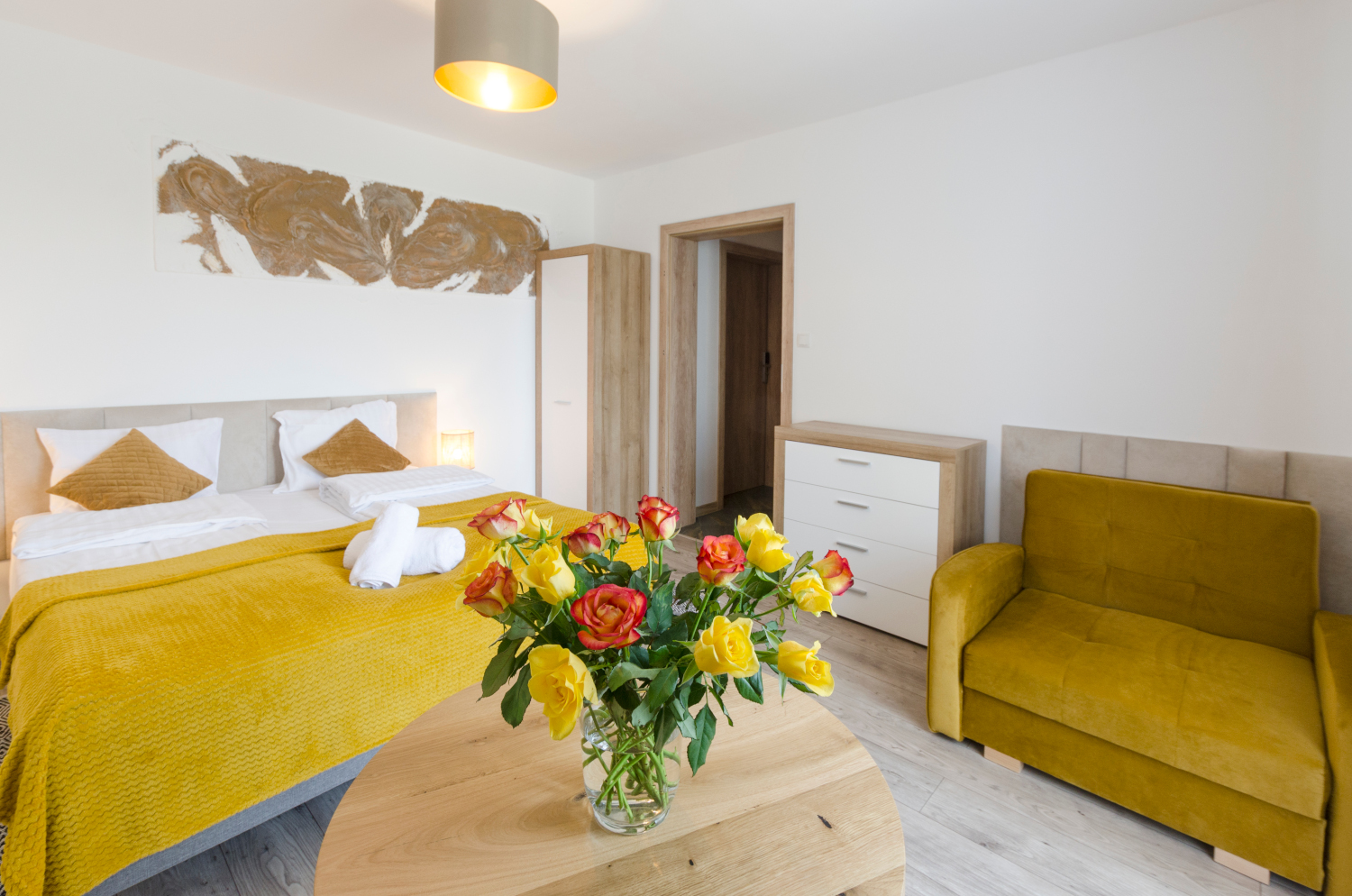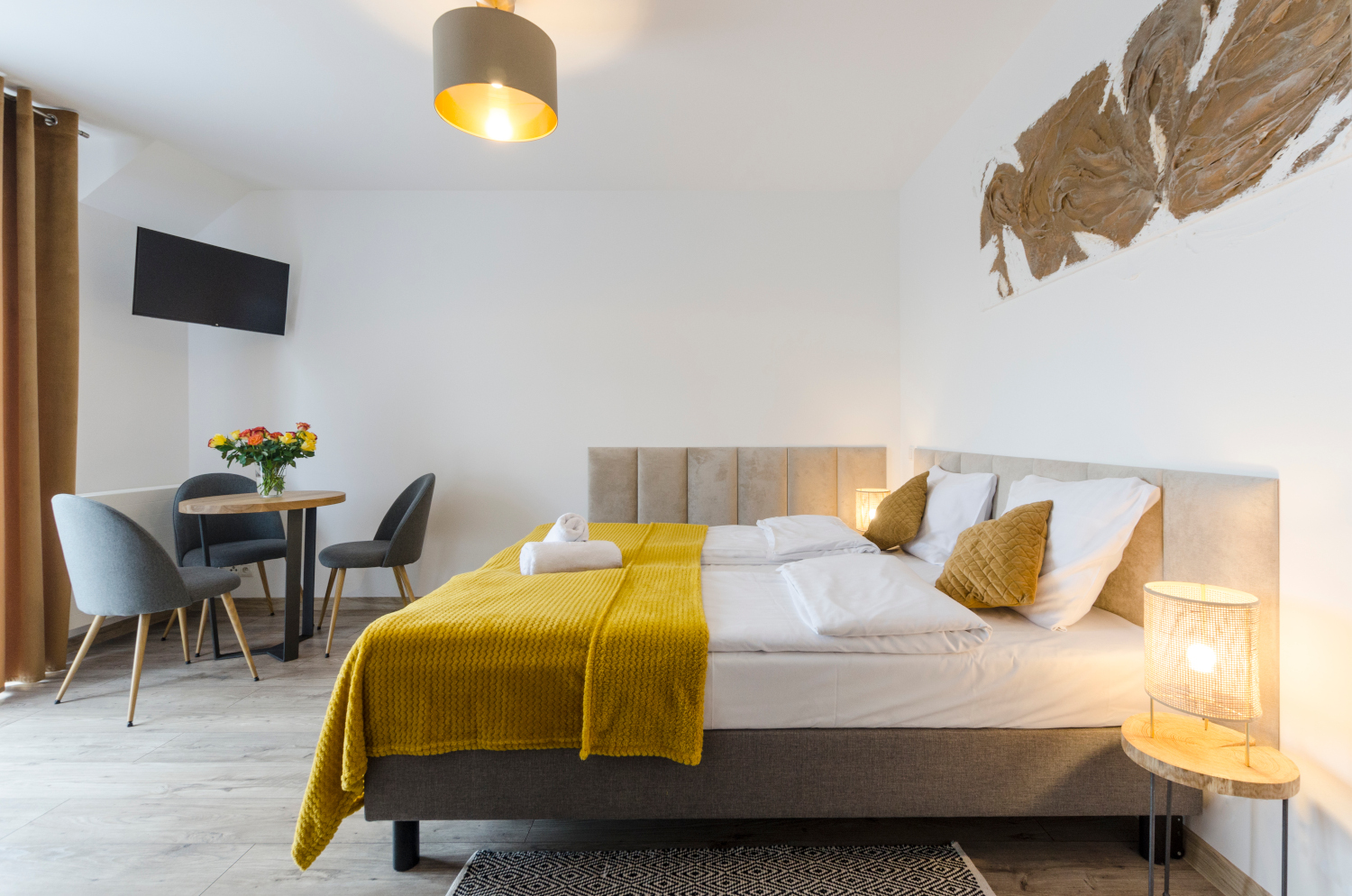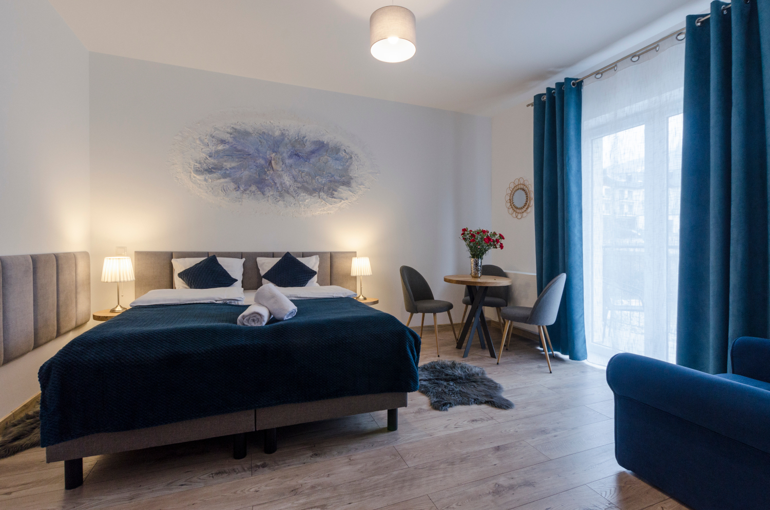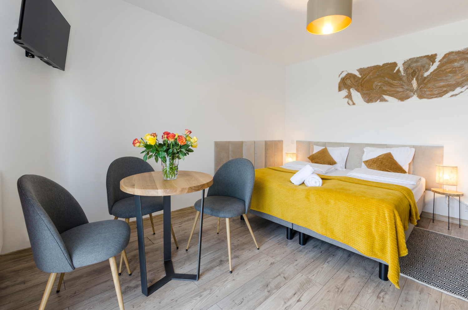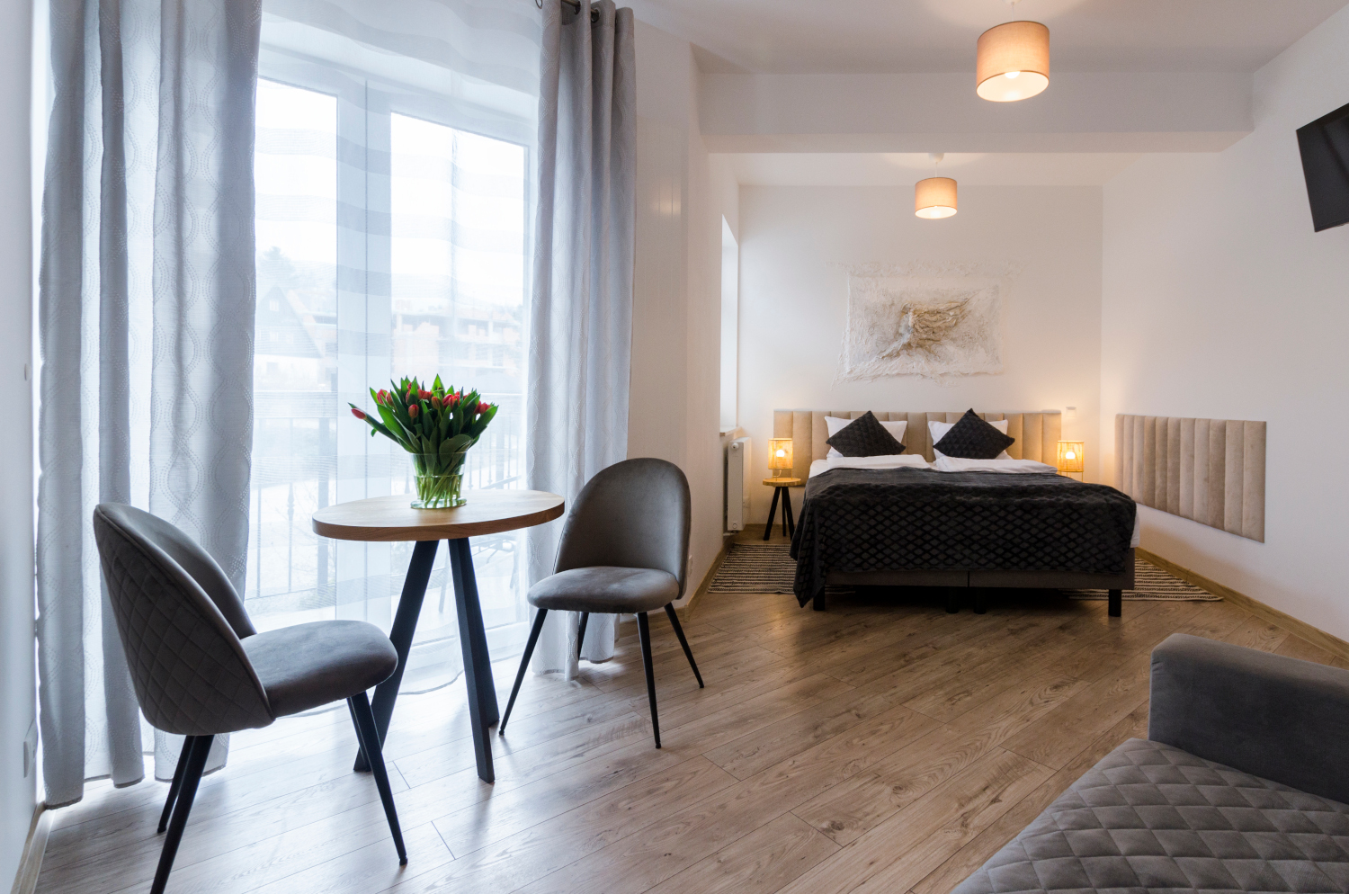 Rodzinne studio 3 osobowe z widokami na Kotlinę Jeleniogórską. W pokoju znajdują się dwa łóżka, które można ustawić razem albo osobno oraz rozkładana sofa. Wielkość pokoju jest idealna dla Rodziny z dzieckiem/dziećmi bądź 3 osób dorosłych.