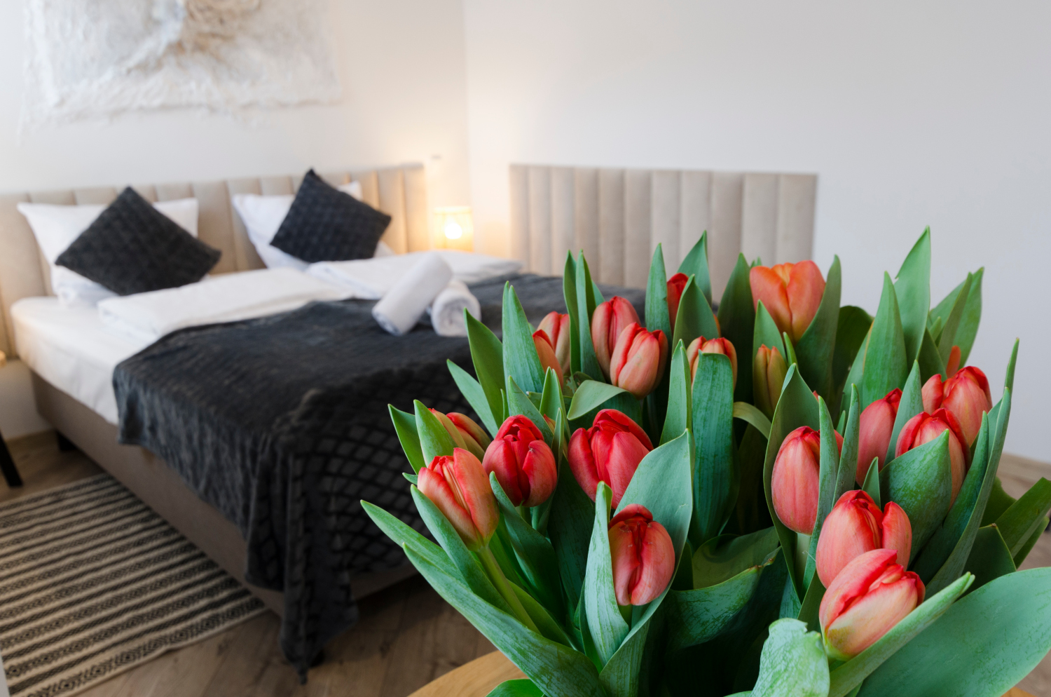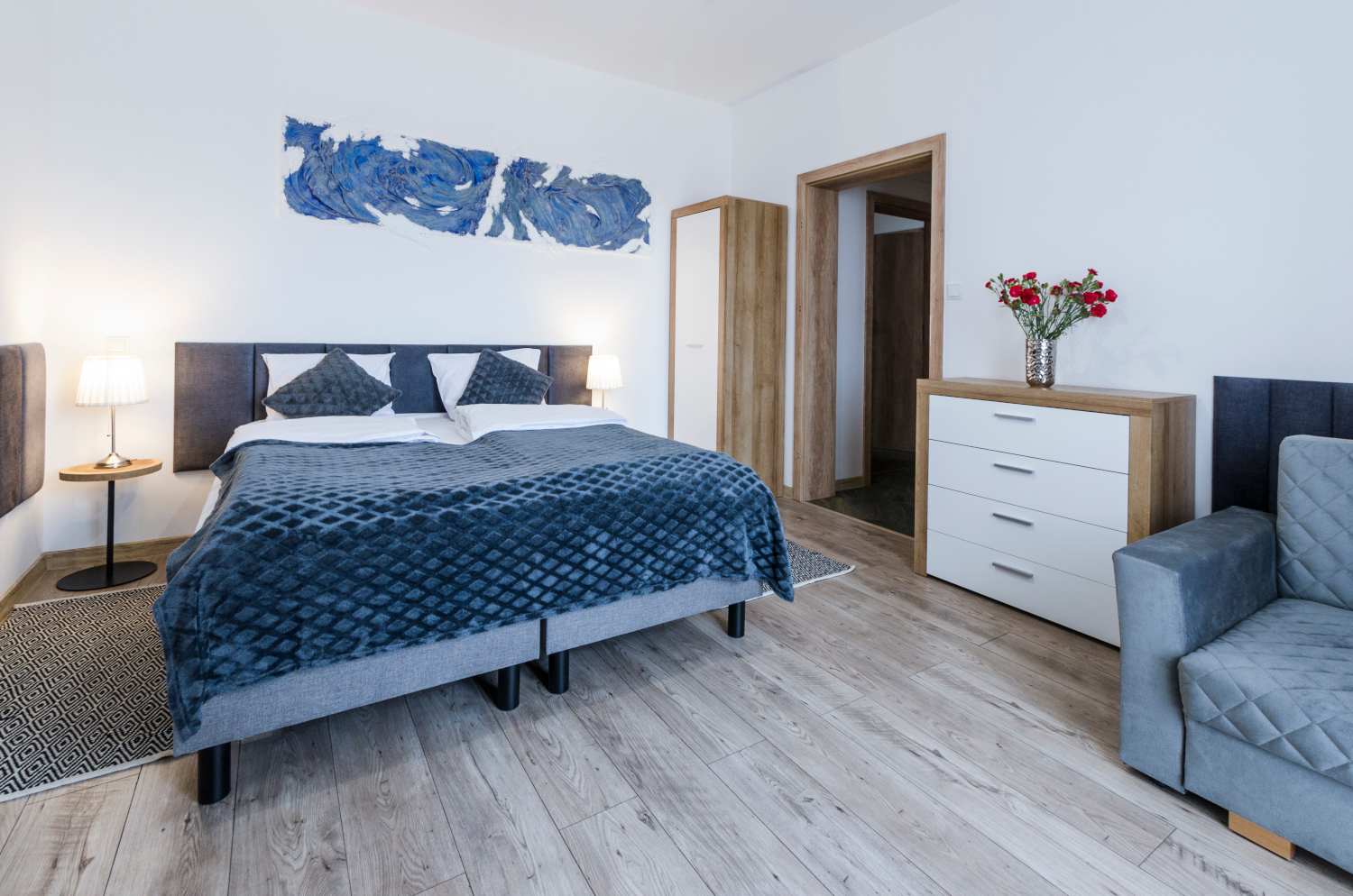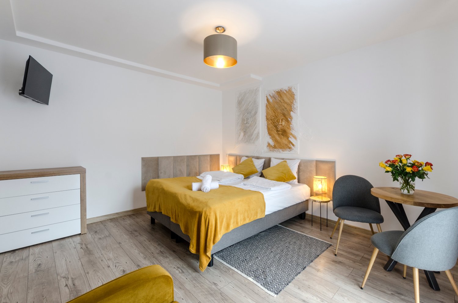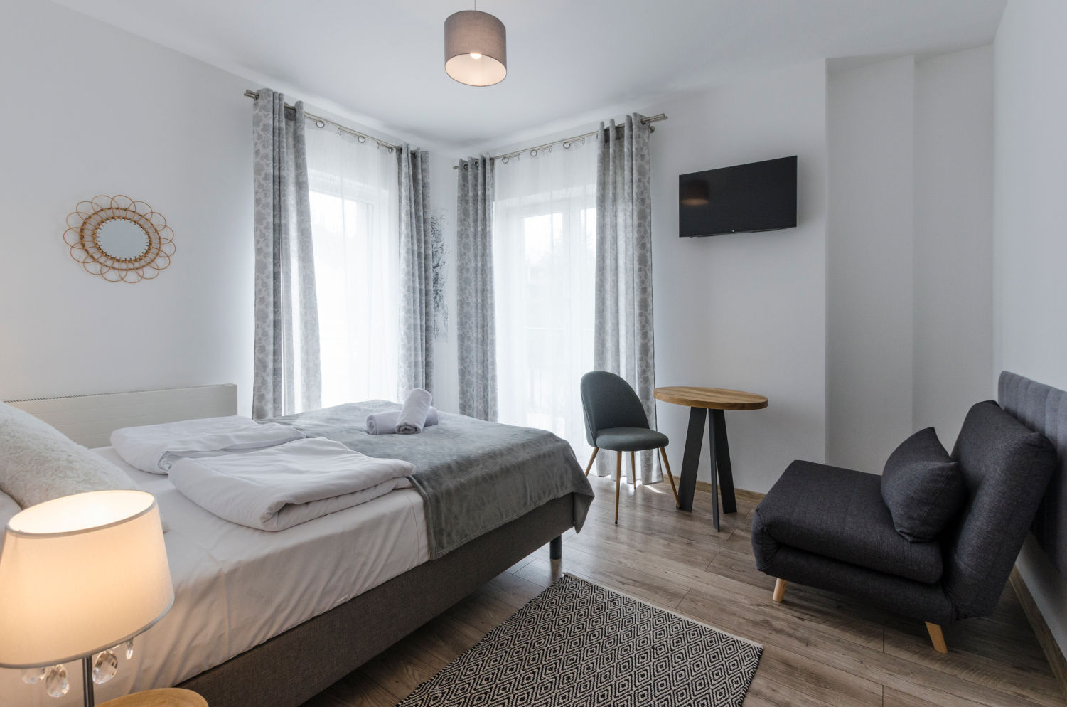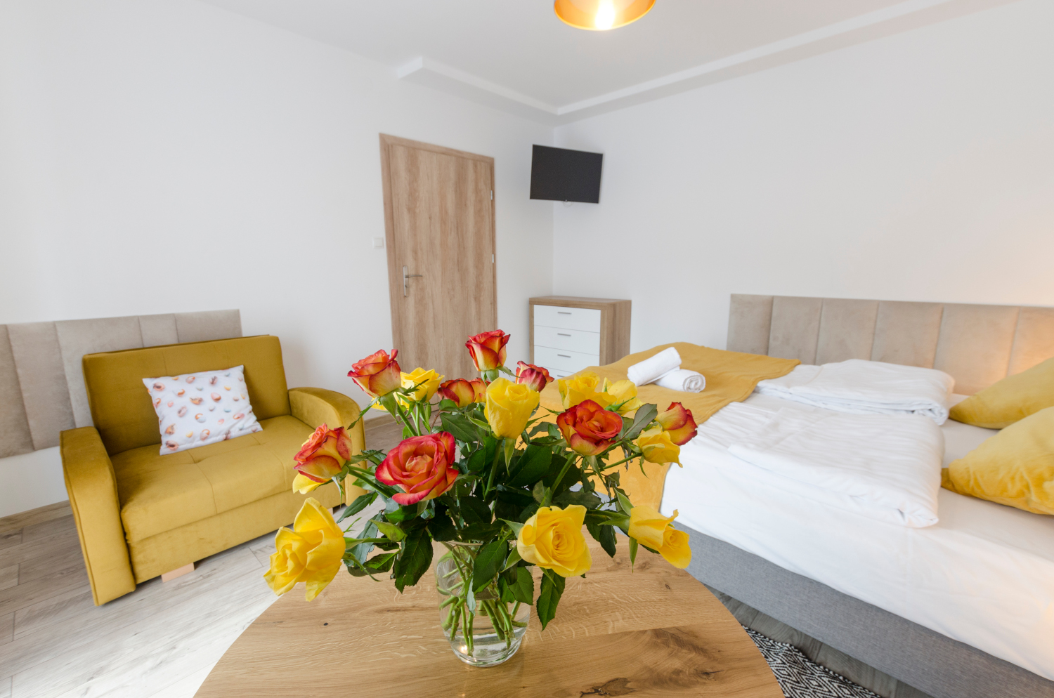 Rodzinne studio 3 osobowe z widokami na Kotlinę Jeleniogórską. W pokoju znajdują się dwa łóżka, które można ustawić razem albo osobno oraz rozkładana sofa. Wielkość pokoju jest idealna dla Rodziny z dzieckiem/dziećmi bądź 3 osób dorosłych.